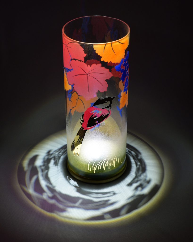 At Schilling Glass® multiple layers of curable powder coating are applied to glass cylinders. Without using fluids, each color is applied electrostatic-ally and separately heat-cured. Before each new layer is added, prior layers are masked with heat resistant tape. Developed by myself, these techniques enable me to create one-of-a-kind, original art glass pieces. My palette includes clear glass. The encircling glass enables images that recombine and transform. Lighted from within by an LED, each piece becomes a lamp that projects a tapestry of images, colors, and shadows.