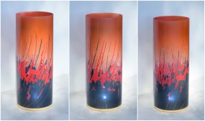 By combining two striking images, one of peeling paint and another of a multi-hued ceramic piece, I’ve created this abstract, fluid composition. The colors are midnight blue, fire cracker red and an orange which is my own mixture of “Cosmic Sassy” and “Spanish Fly.” When projecting images onto any surface, this lamp is a spectacular performer. Ranging from the internal LED alone, to direct sunlight, to artificial lighting, each setting results in displays that grab your vision and hold it.