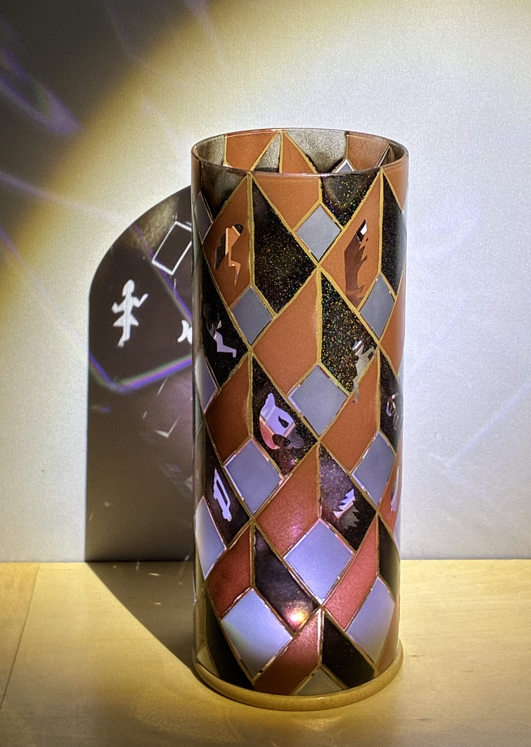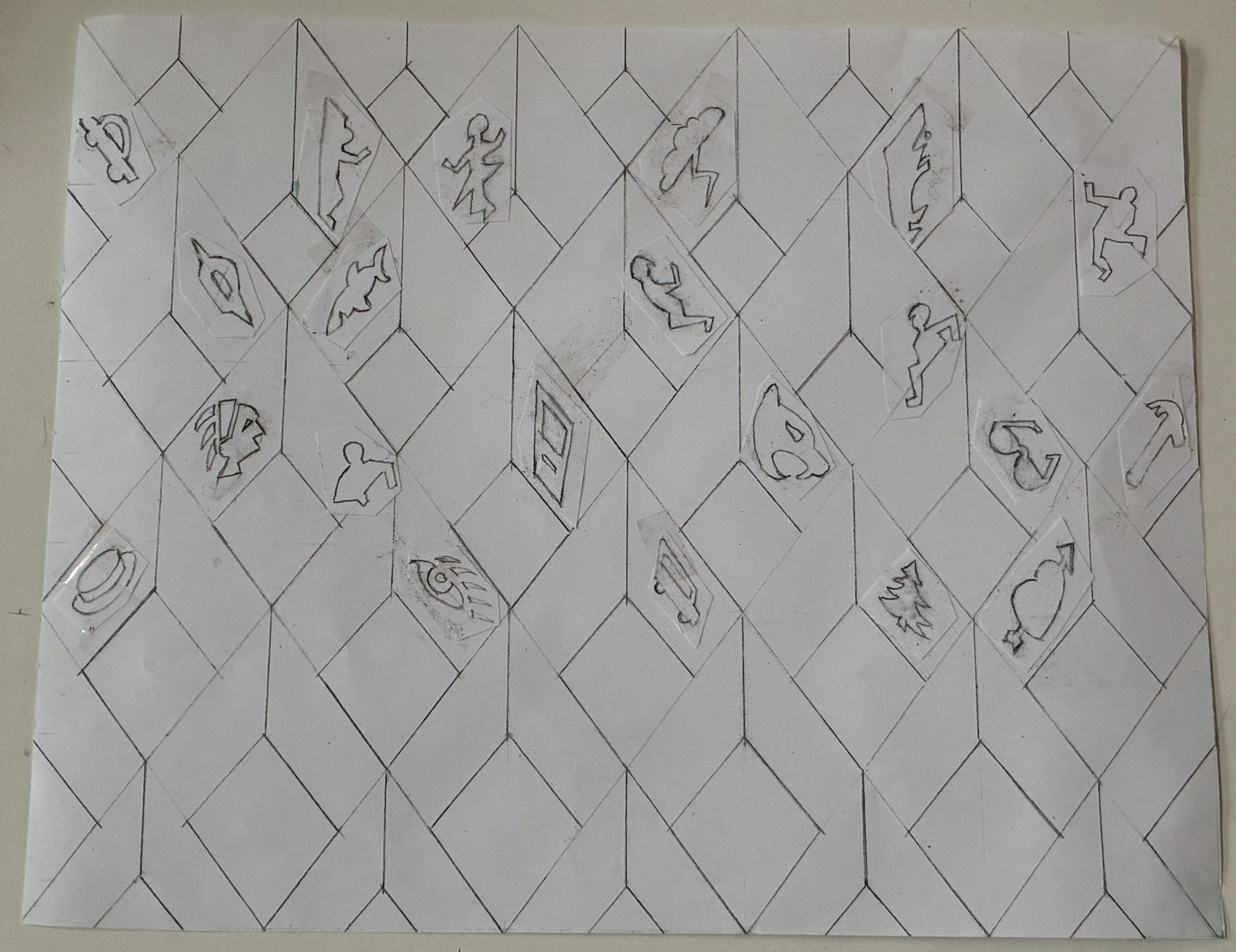 Stray thoughts are depicted in caricature. They populate a classical spiraling design pattern that suggests a sequence of rooms with walls and floors.