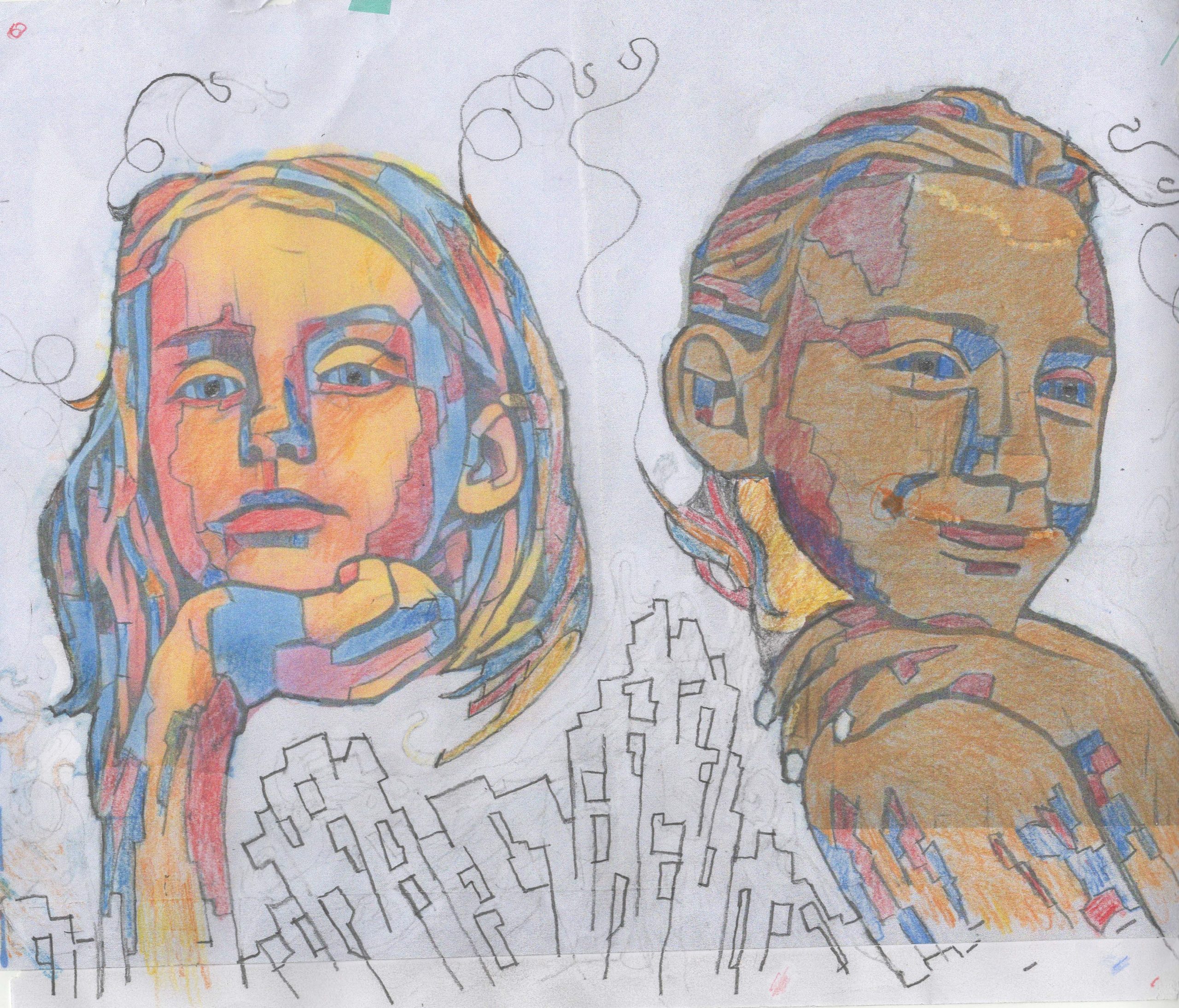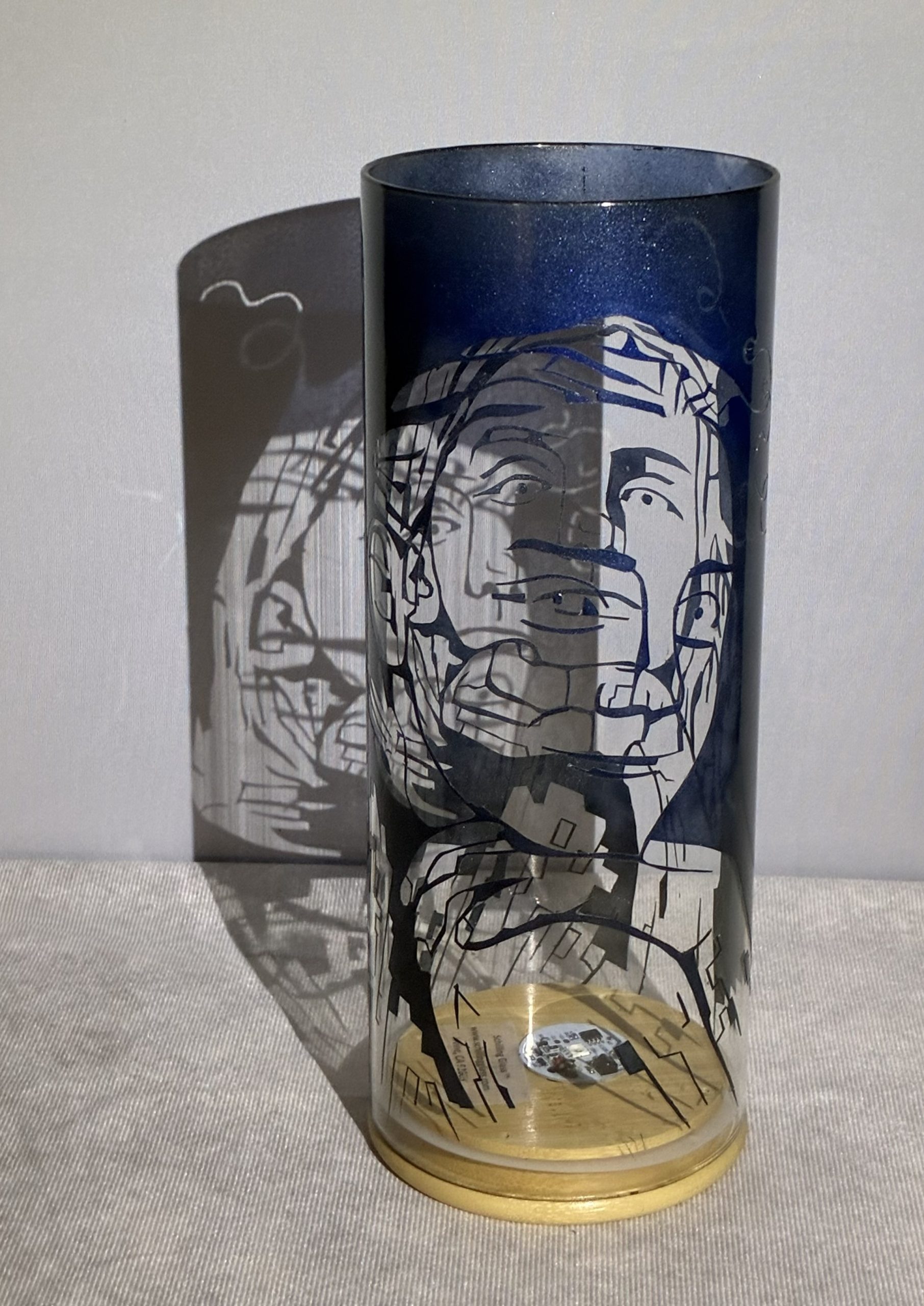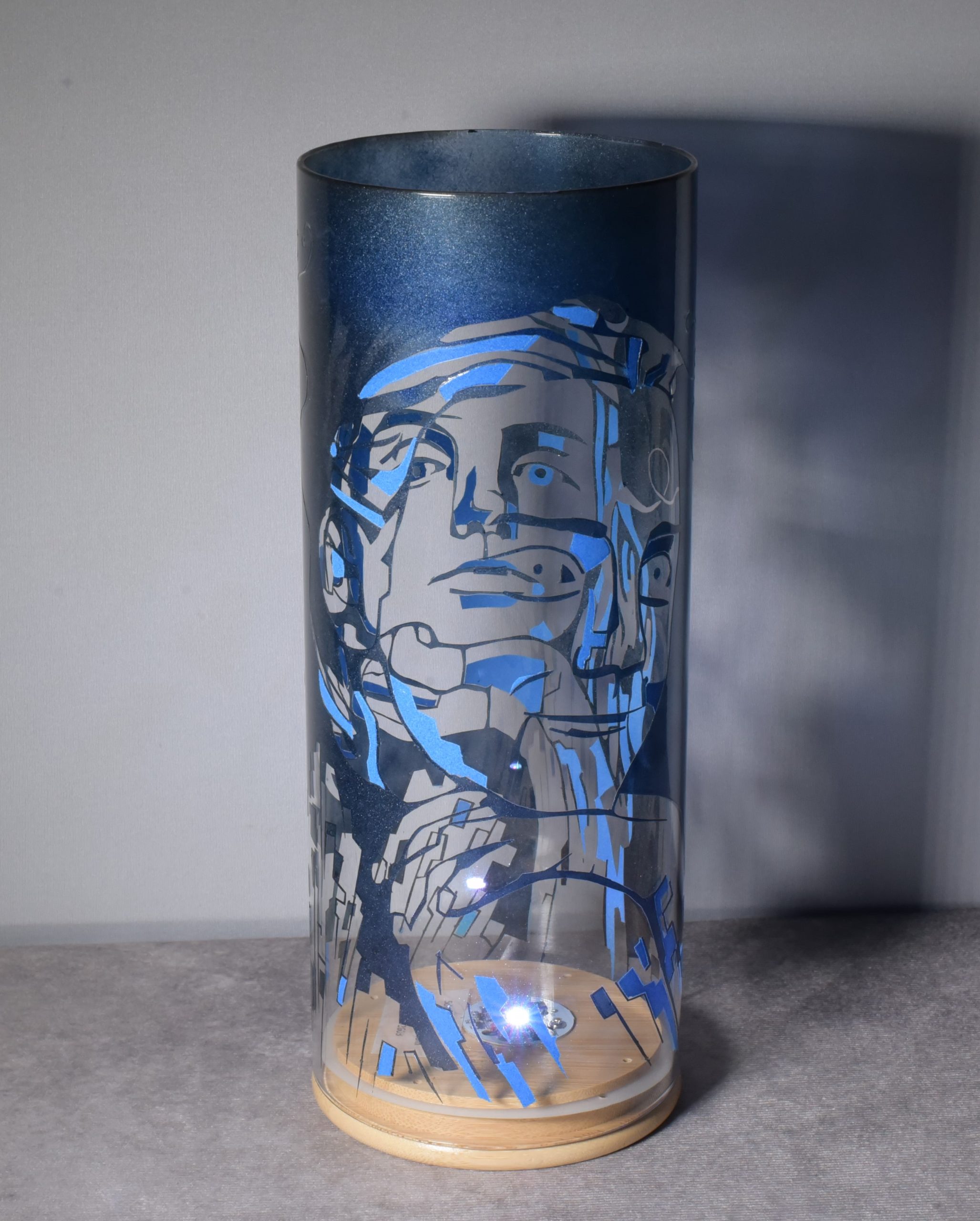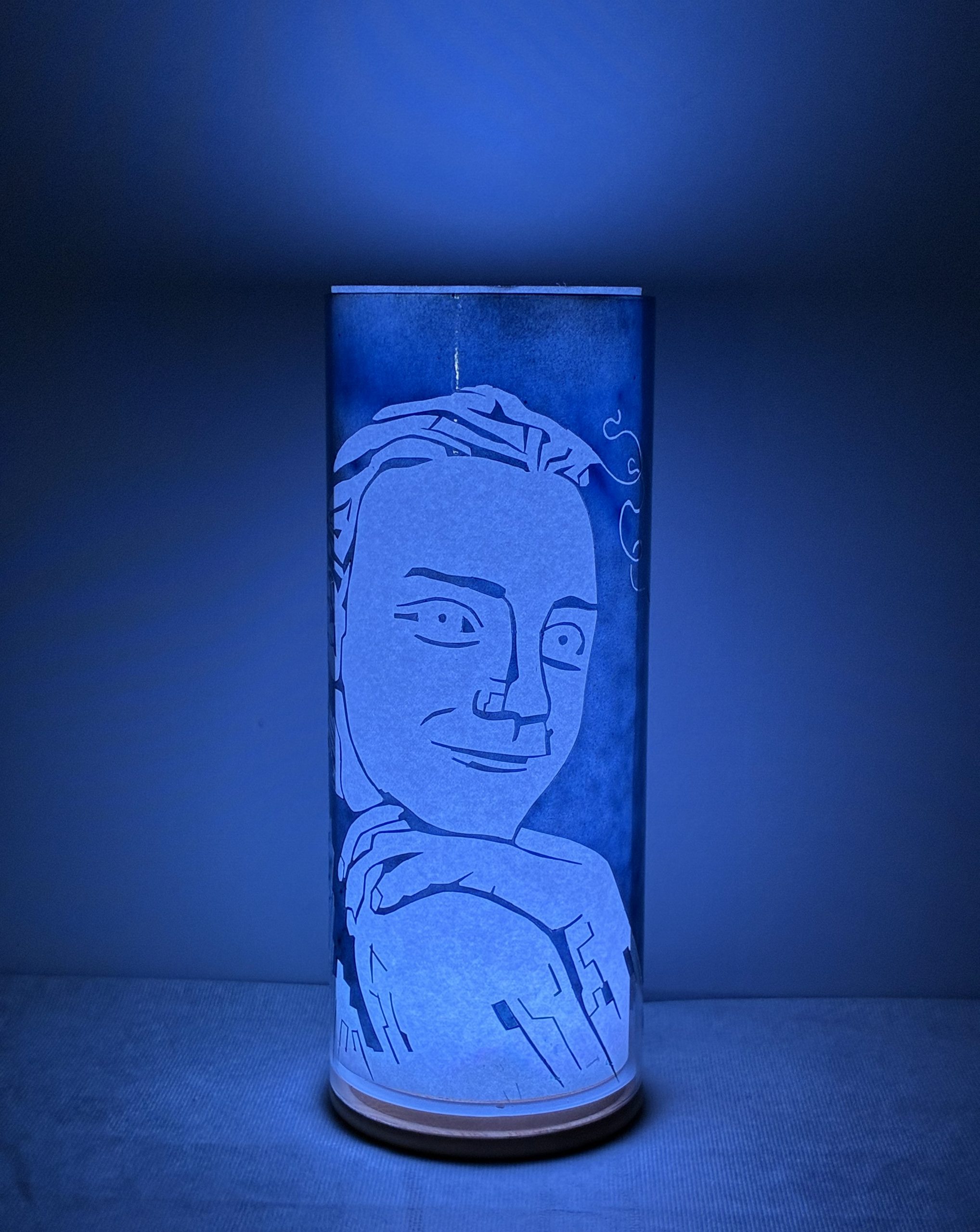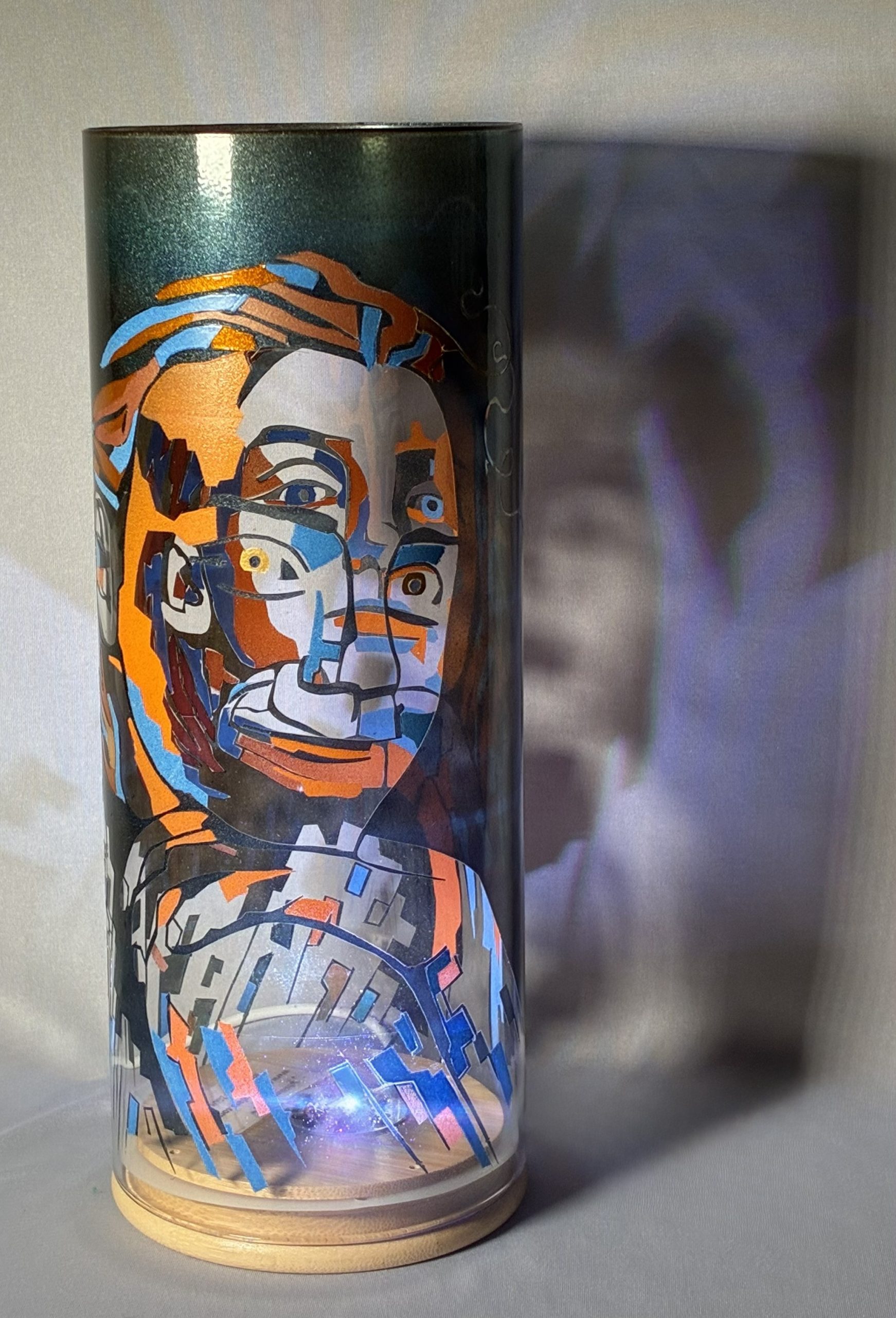 Among the most daring challenge I’ve undertaken is creating a portrait on a glass lamp. Here is a duel portrait of Gunner, “almost 12”, and eight-year-old Paige . They are my grandchildren. My design sketch evolved after I’d converted their photos first into line drawings. These I then converted into portraits in the constructionist tradition. When I asked Gunner if this image should look like him, he answered yes. Shown is the second of multiple glaze overlays, I am several color overlays away from asking that question again.