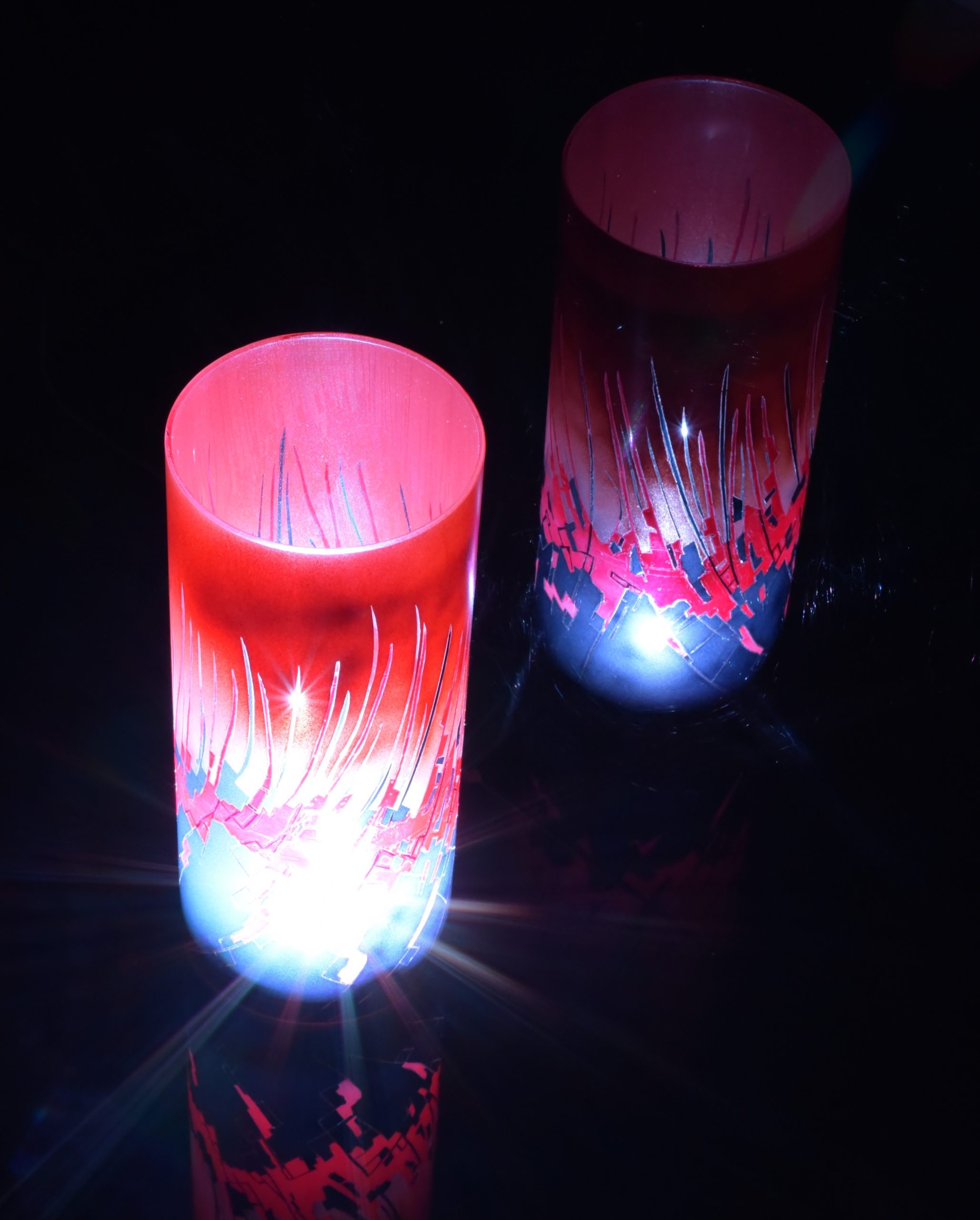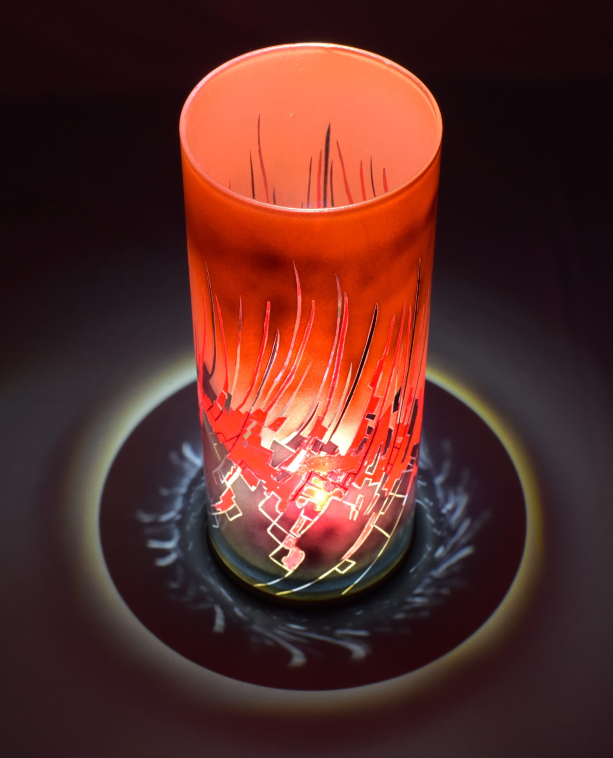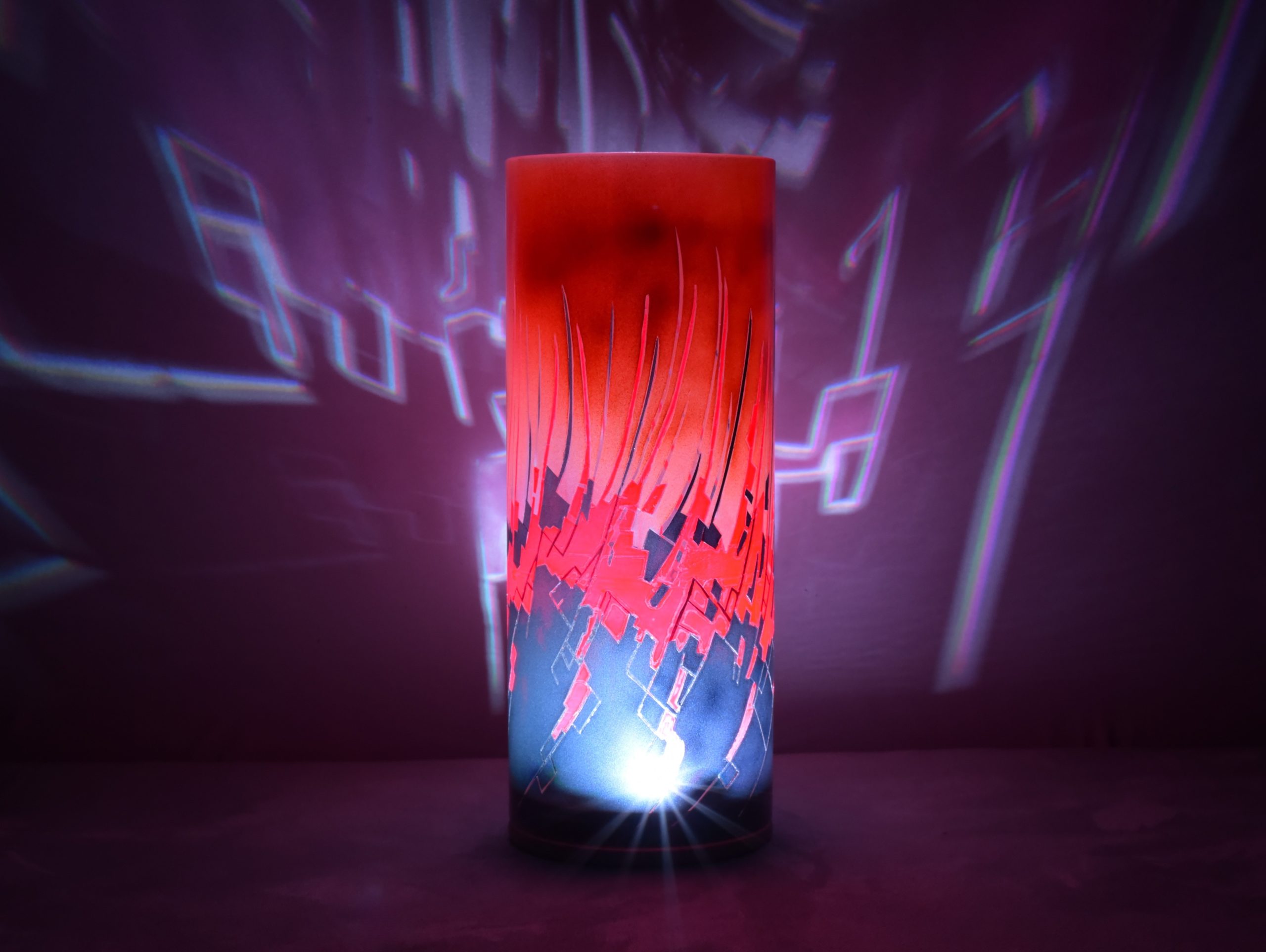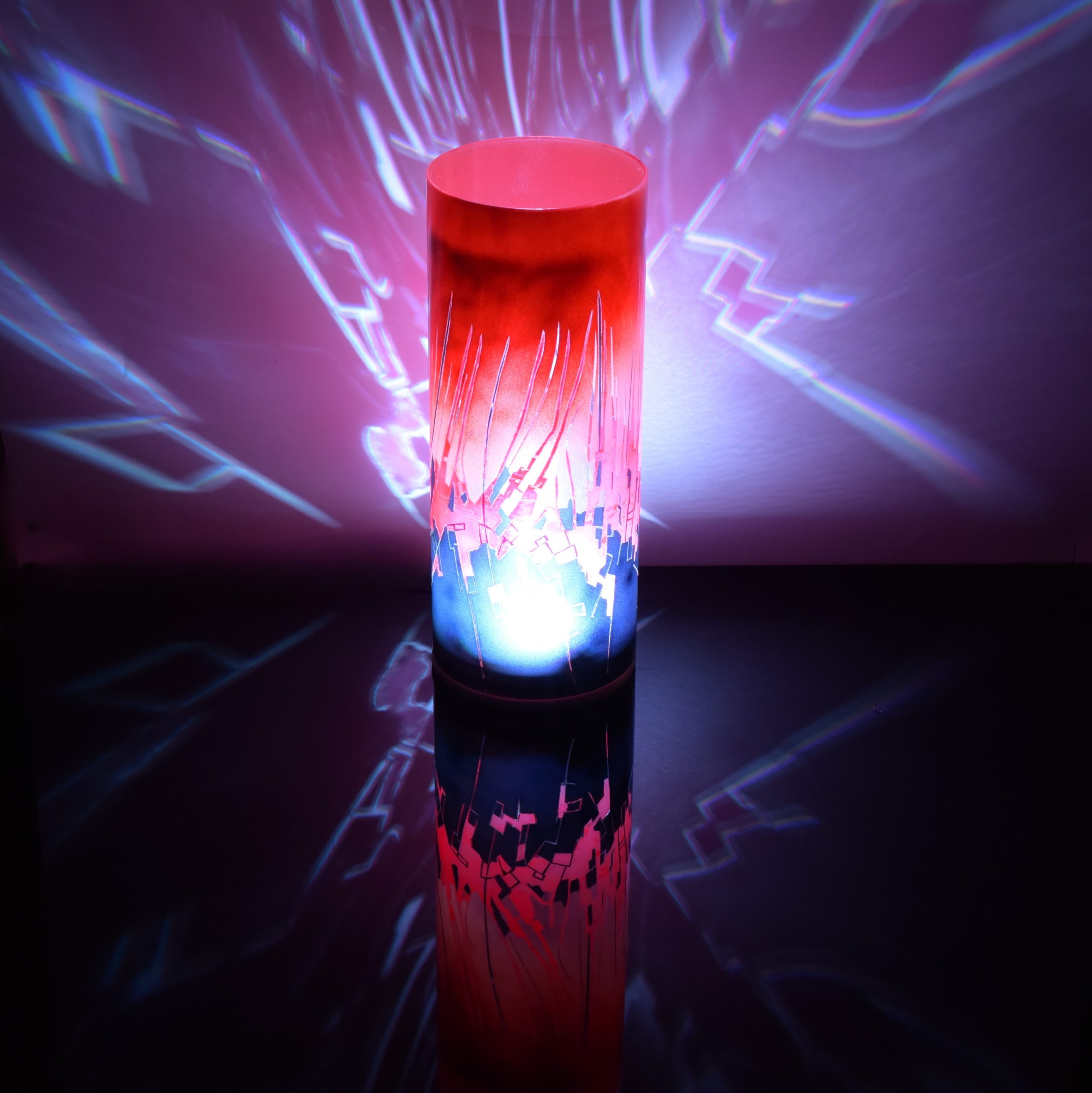By combining two striking images, one of peeling paint and another of a multi-hued ceramic piece, I’ve created this abstract, fluid composition. The colors are midnight blue, fire cracker red and an orange which is my own mixture of “Cosmic Sassy” and “Spanish Fly.” When projecting images onto any surface, this lamp is a spectacular performer. Ranging from the internal LED alone, to direct sunlight, to artificial lighting, each setting results in displays that grab your vision and hold it.