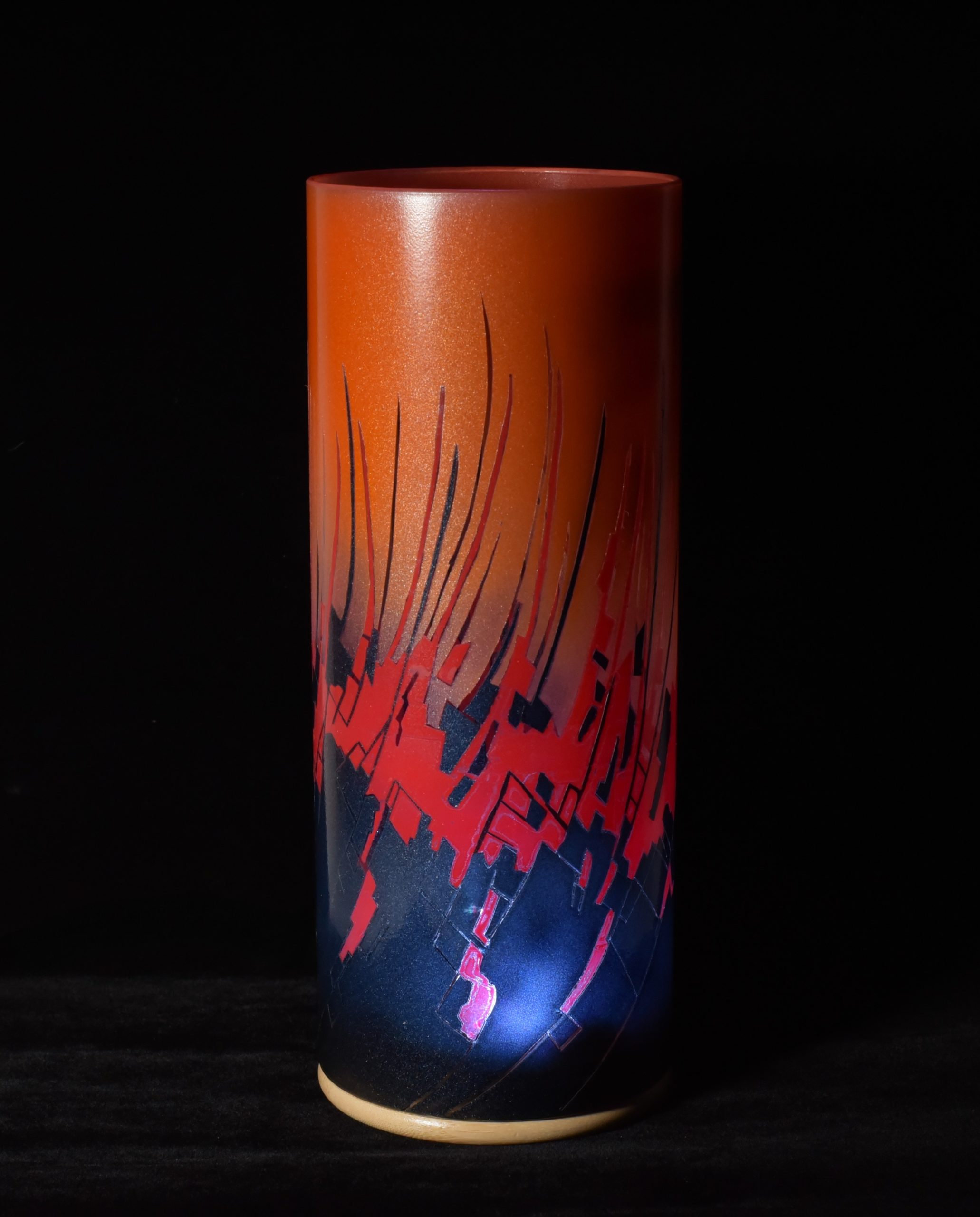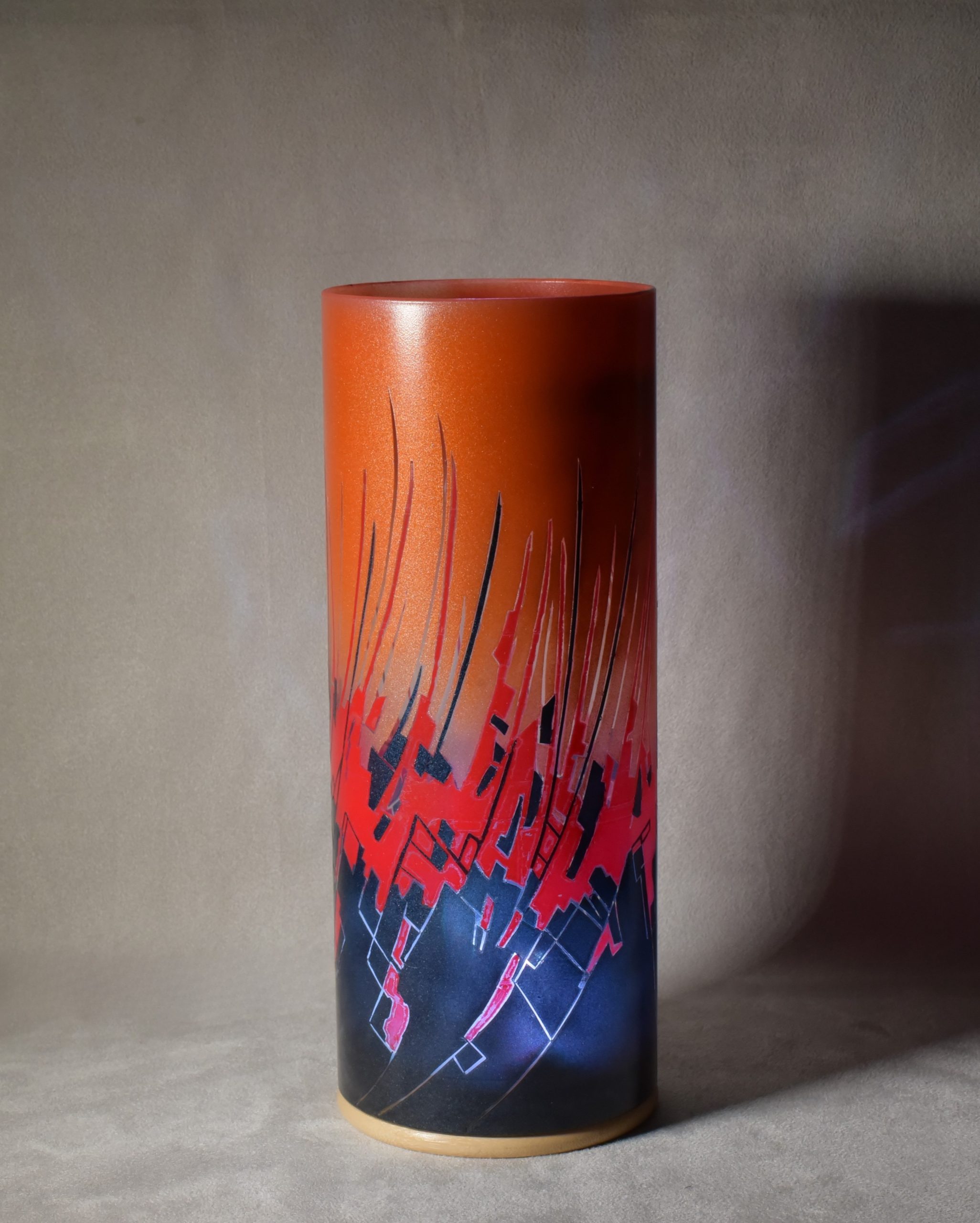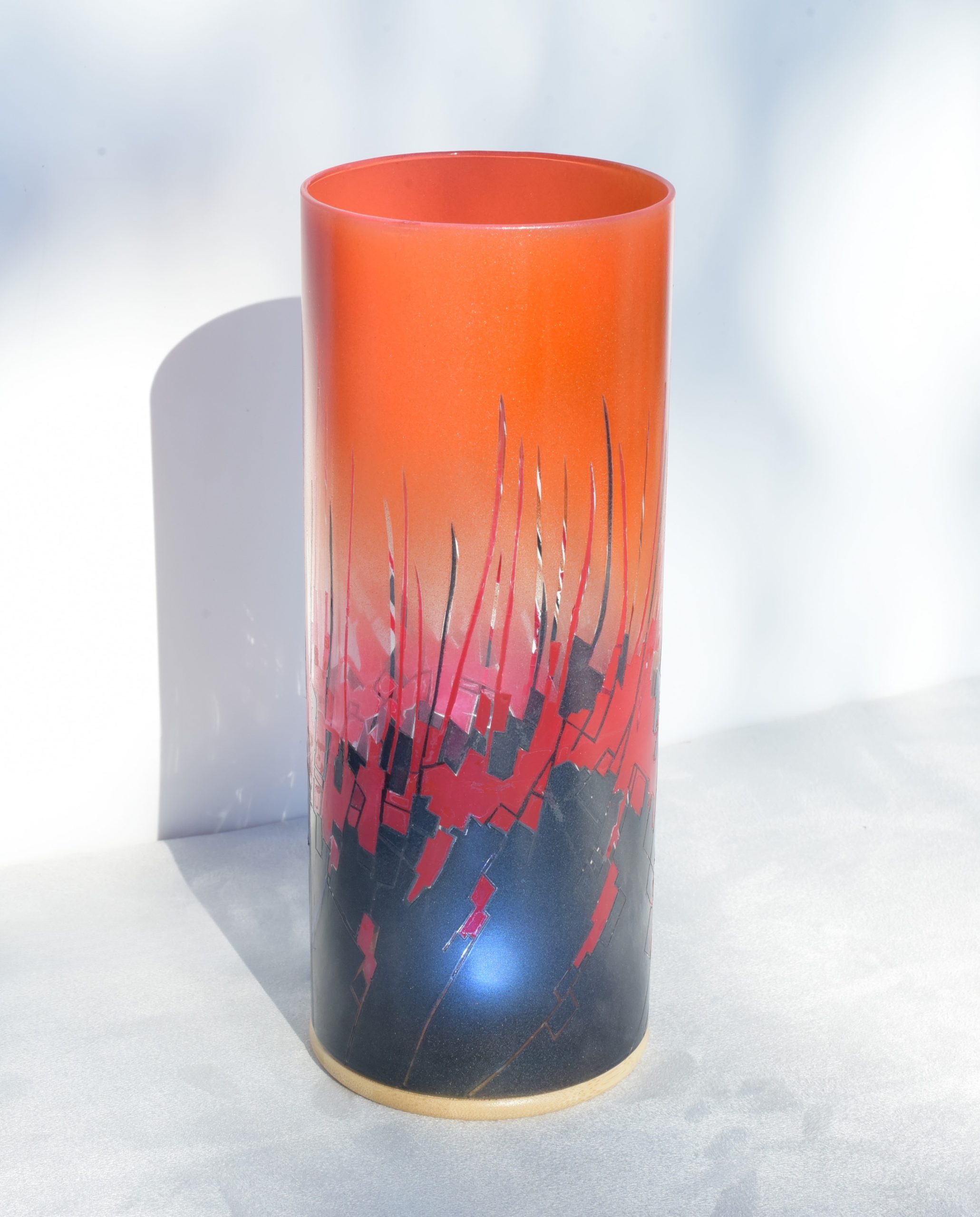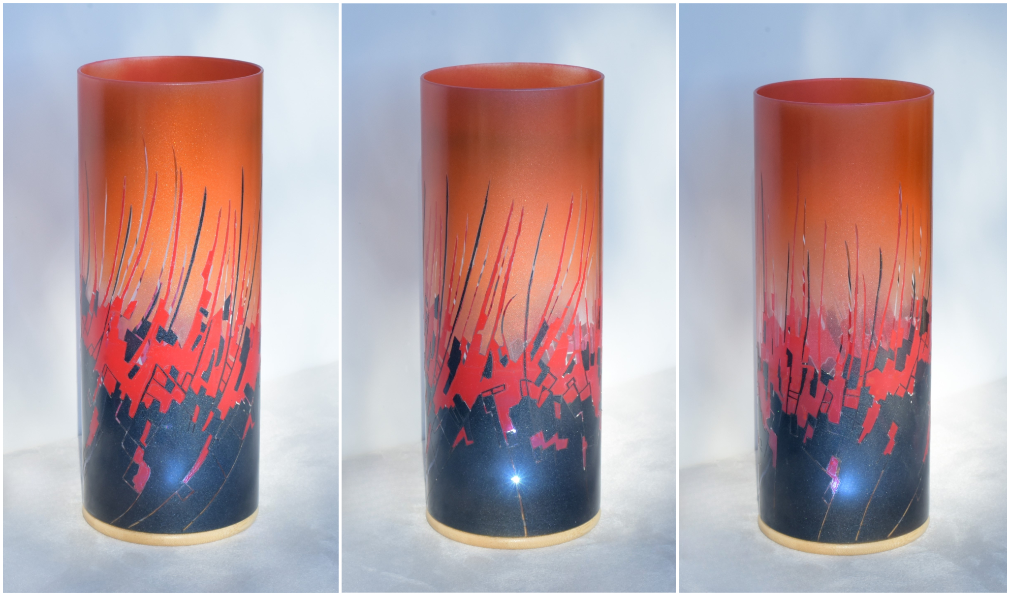 By combining two striking images, one of peeling paint and another of a multi-hued ceramic piece, I’ve created this abstract, fluid composition. The colors are midnight blue, fire cracker red and an orange which is my own mixture of “Cosmic Sassy” and “Spanish Fly.” When projecting images onto any surface, this lamp is a spectacular performer. Ranging from the internal LED alone, to direct sunlight, to artificial lighting, each setting results in displays that grab your vision and hold it.