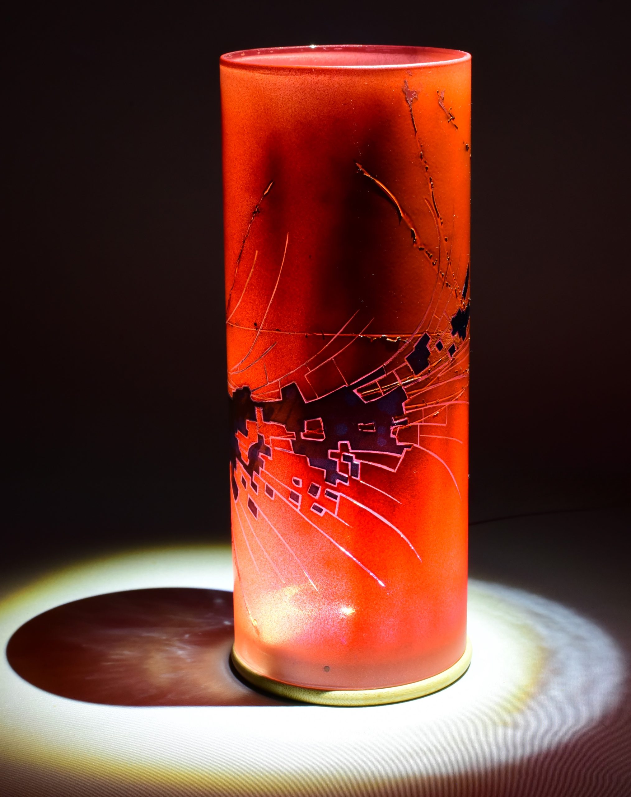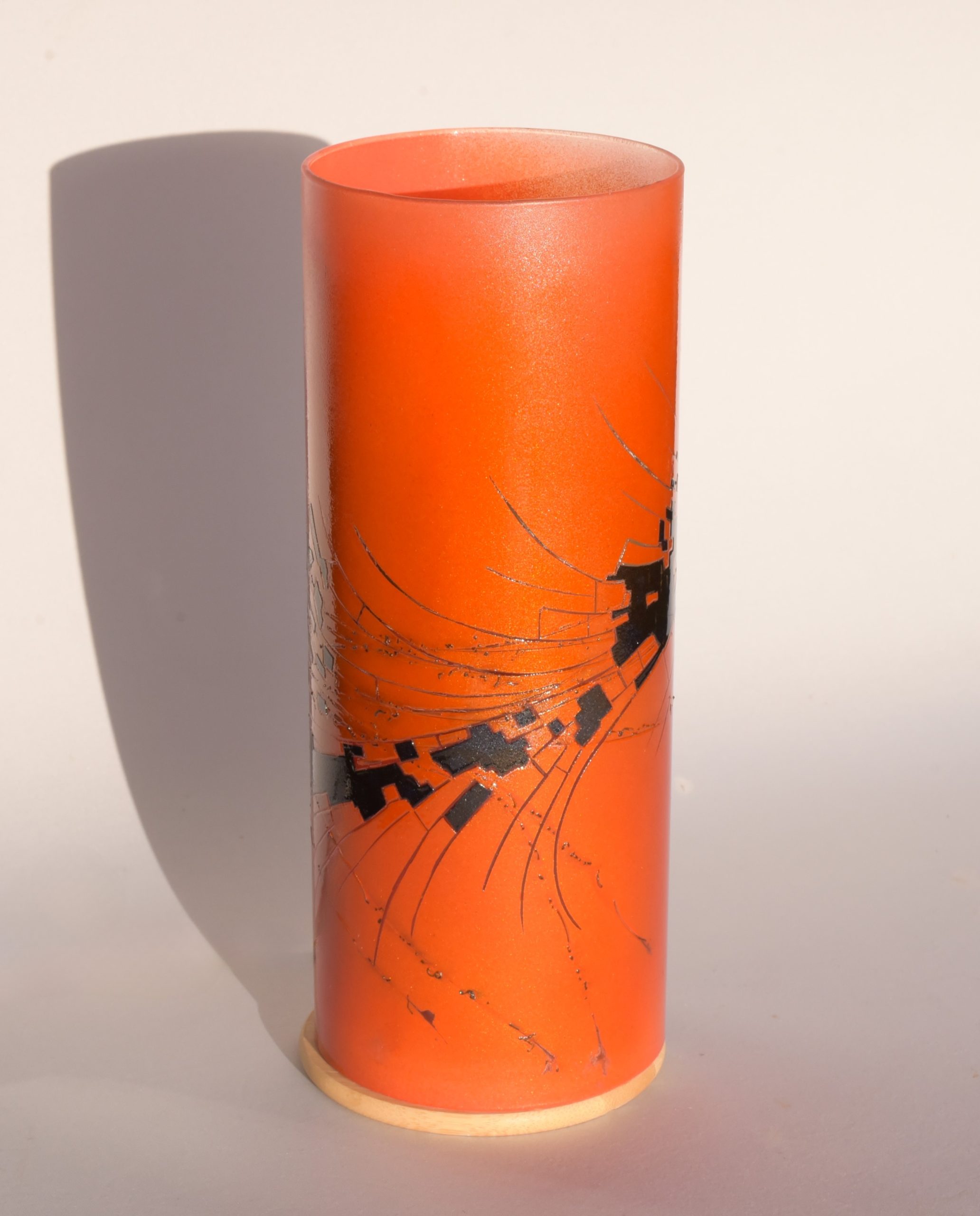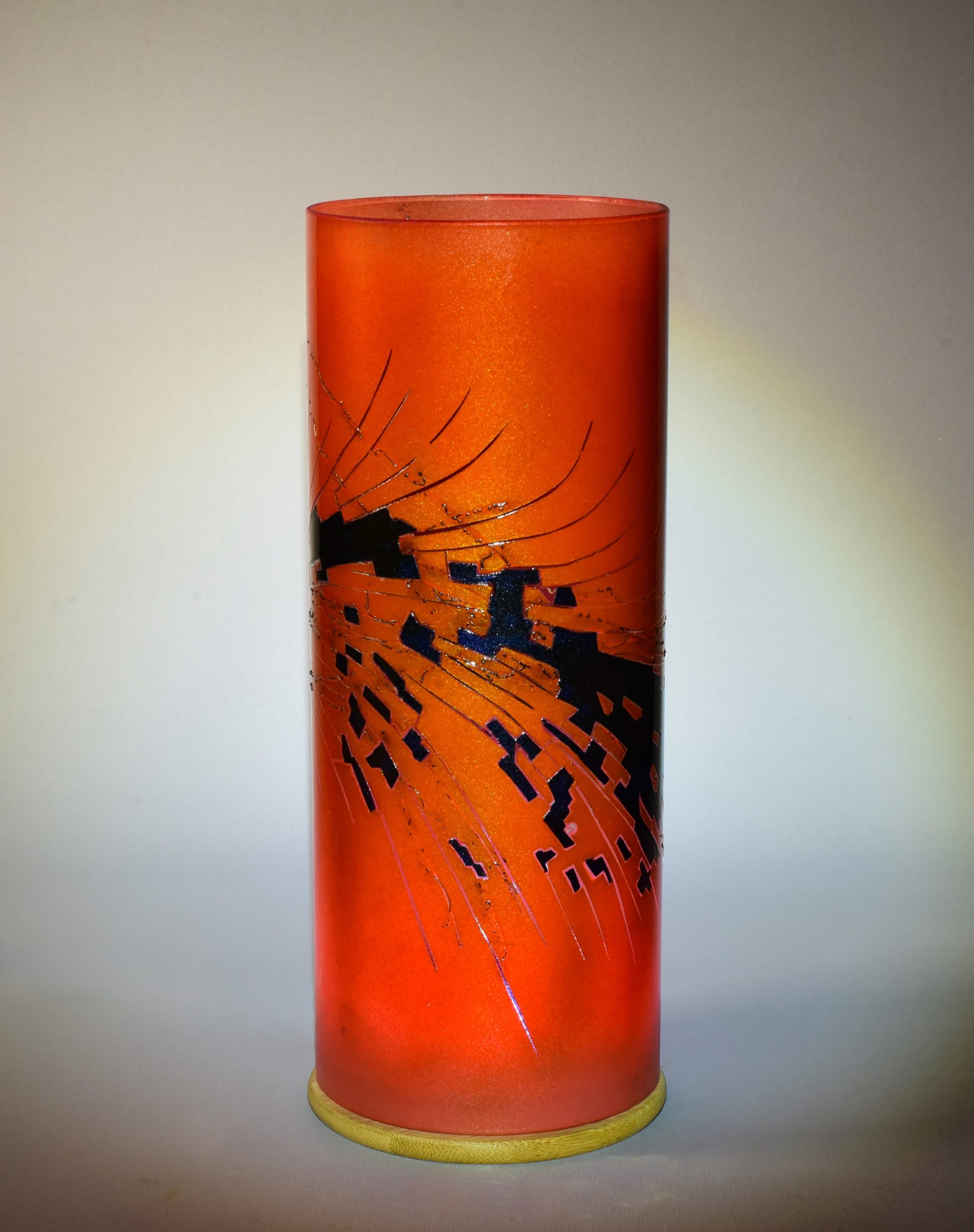Two colors encircle this accent lamp. The black is labeled “Illusion Midnight”. The orange is a 50/50 mix of “Cosmic Sassy” and “Spanish Fly”. The curved streaks are clear glass. The wiggly black lines are scorched horse tail hair.