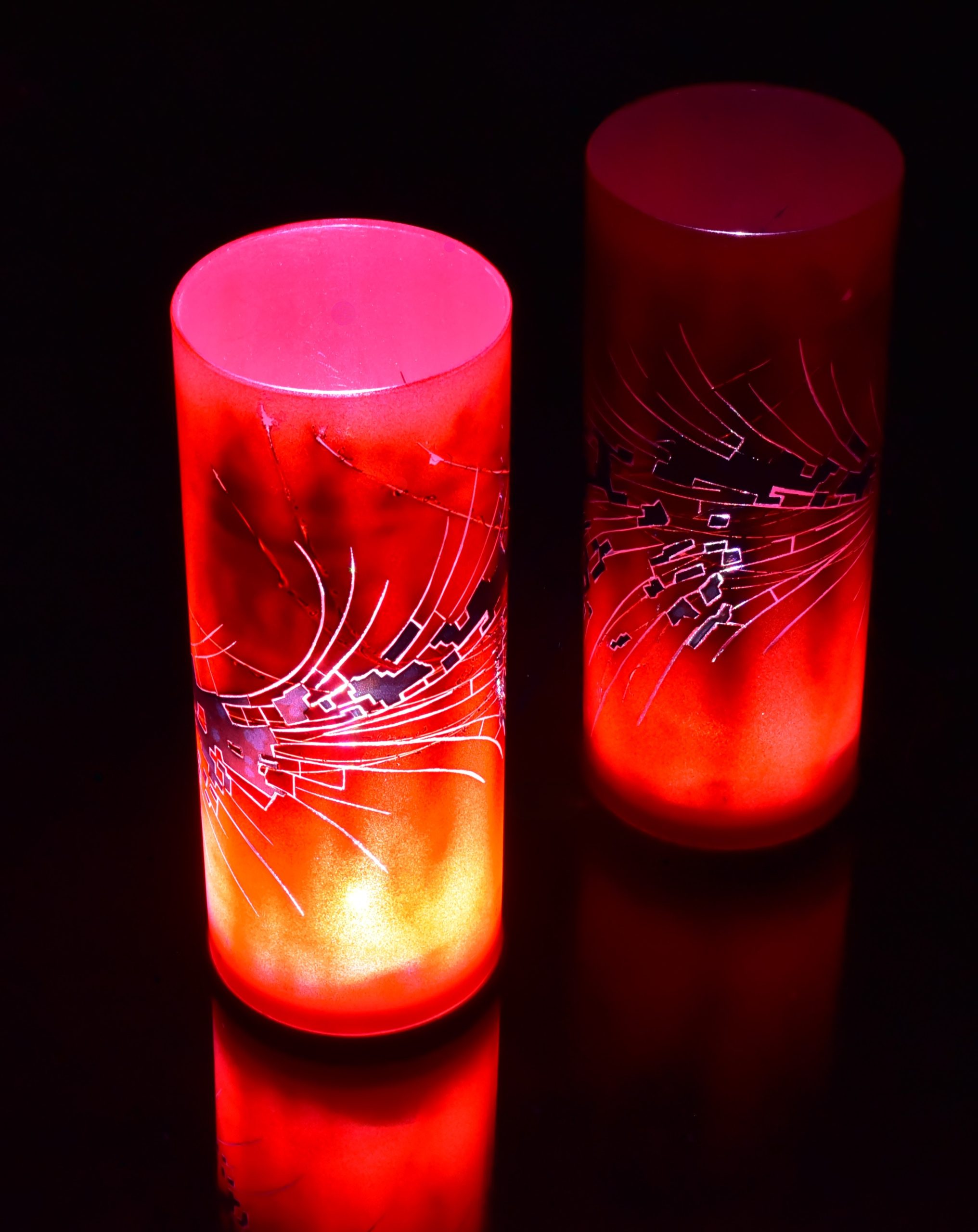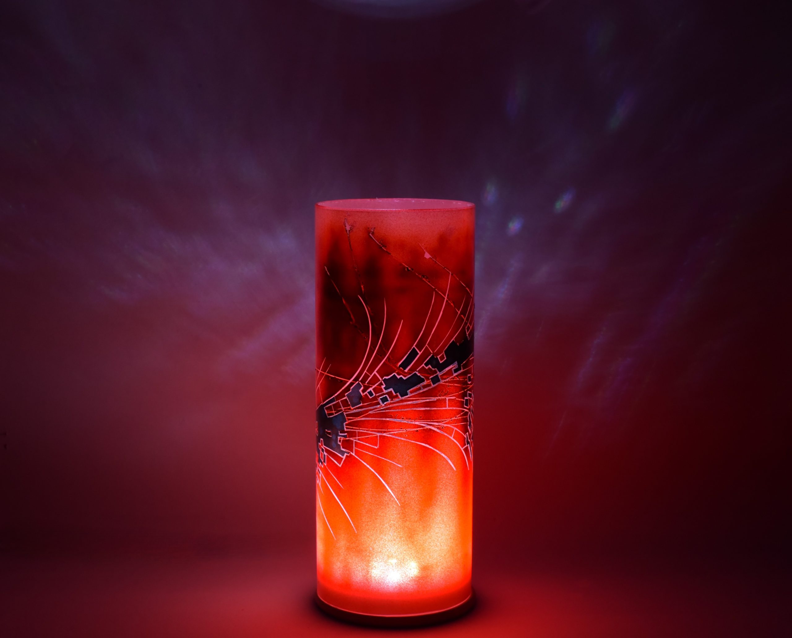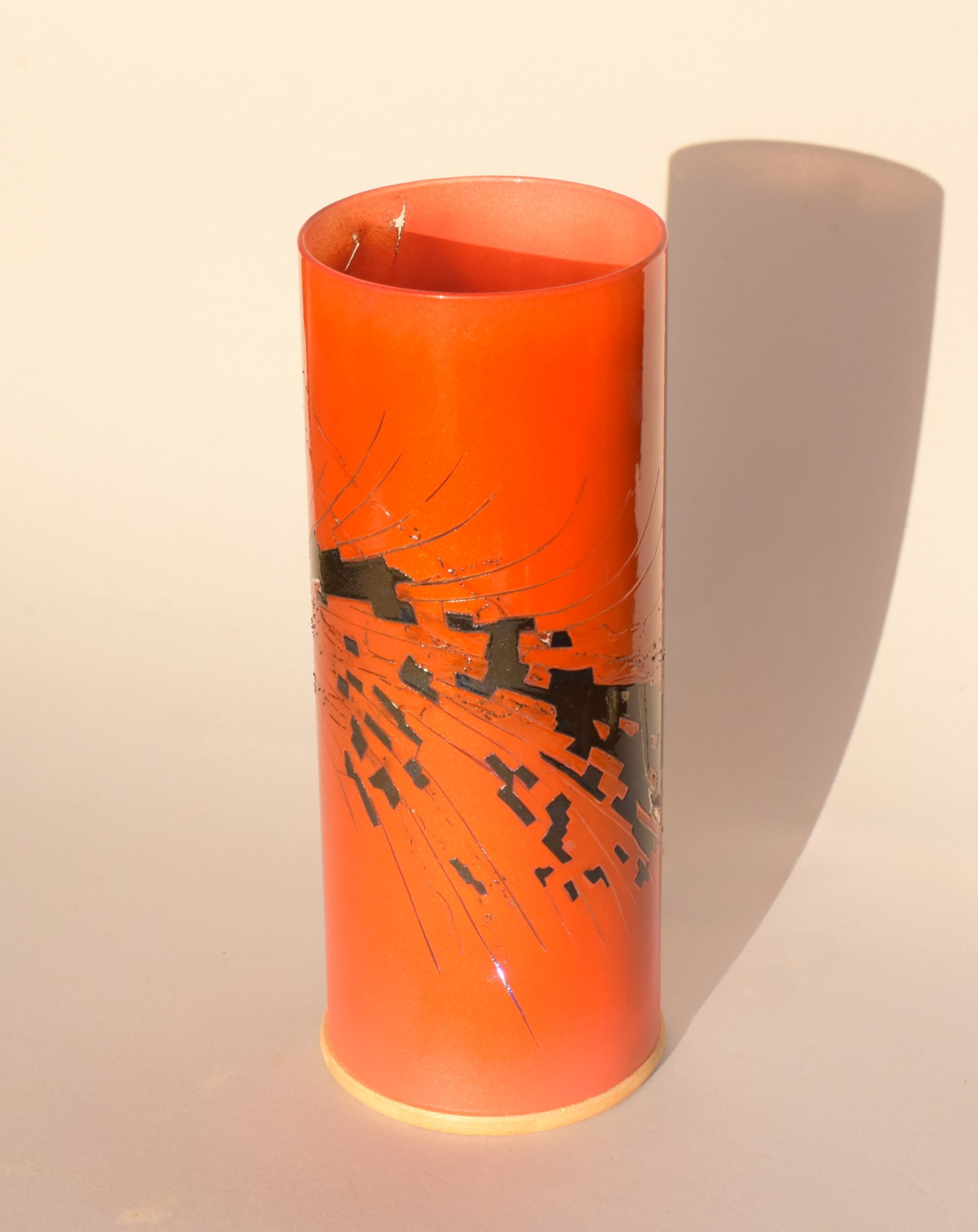 Two colors encircle this accent lamp. The black is labeled “Illusion Midnight”. The orange is a 50/50 mix of “Cosmic Sassy” and “Spanish Fly”. The curved streaks are clear glass. The wiggly black lines are scorched horse tail hair.