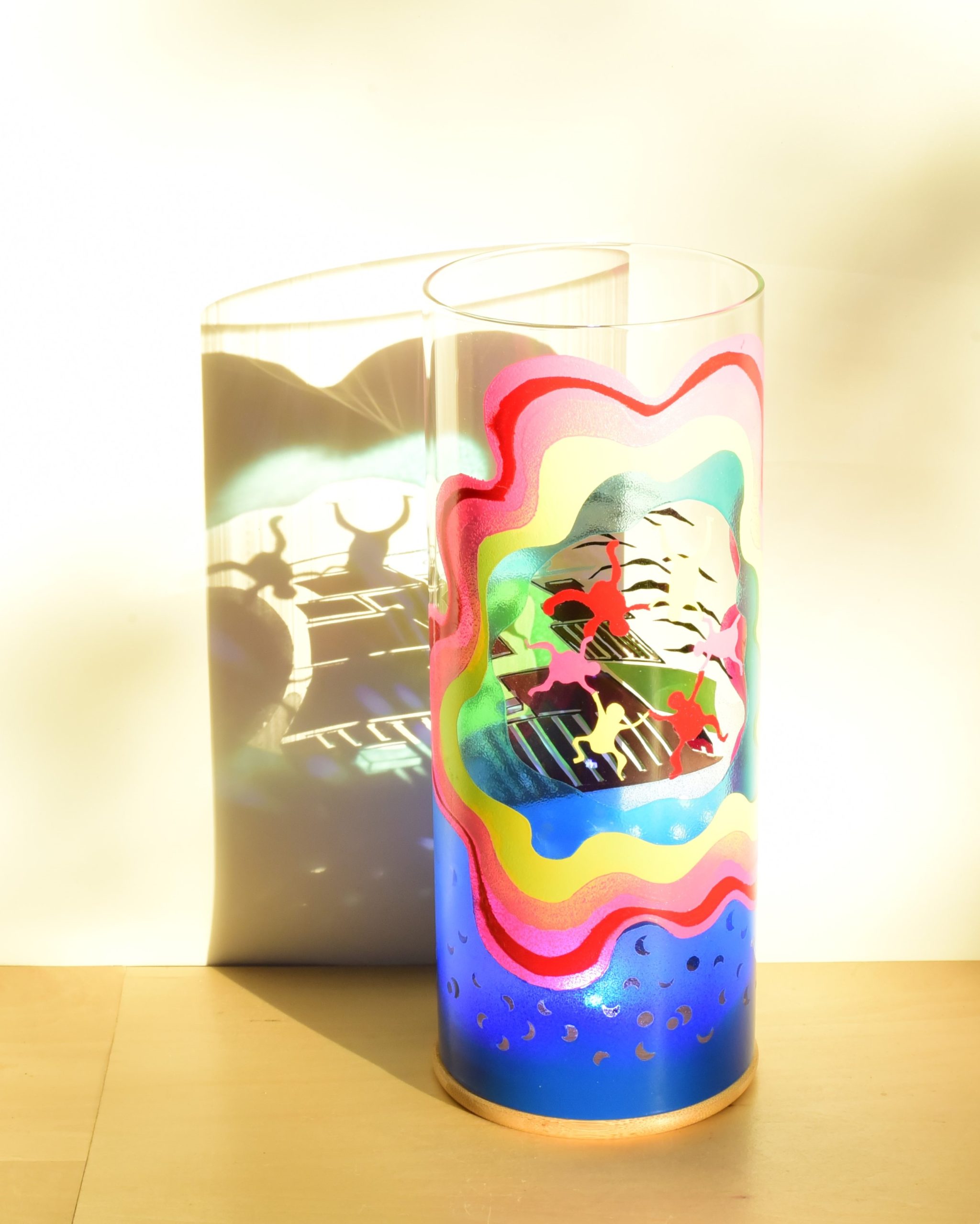 A lamp with an image that relates to an individual sports athletic event: A friend challenged me. A group of sky divers floated into my imagination. Now the fun started. On the face of my lamp, they fall through a particolored hole in the sky. Below, on the back face of my lamp, is a landing zone. Agricultural fields bounded by dark hills on the left and on the horizon, a slender river.
