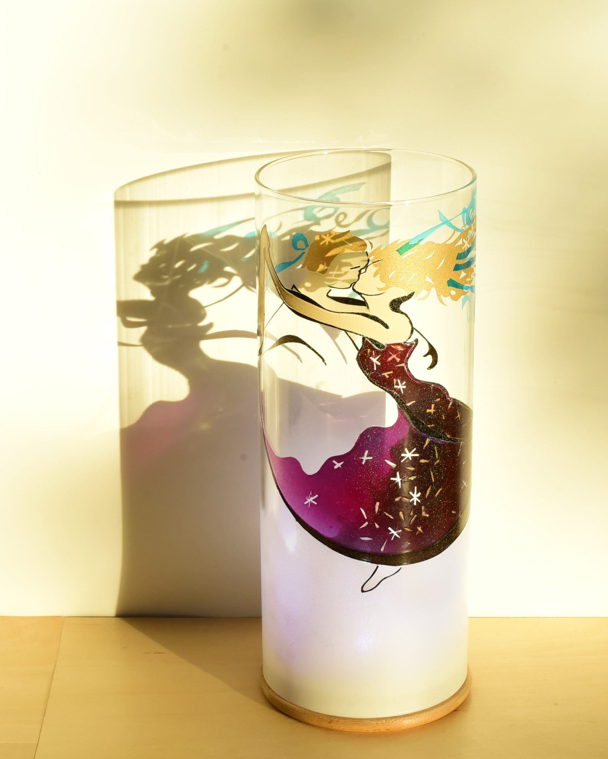 Dance is all motion and posture. In the tango, in an instant both dancers freeze into a striking pose where one embraces the other. On this unique art glass lamp that’s all here. From one viewing, her head rests on his shoulder. From another, he dives under their uplifted arms. Creating this lamp was play day for me. From the first glazed outline in black to the last float in white at the bottom, this glass lamp was a delight at every gaze.